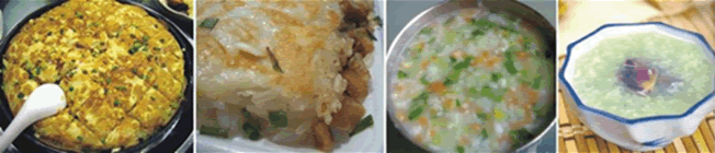 1. 粥:大米粥、红豆粥、绿豆粥、八宝粥、蔬菜营养粥、皮蛋瘦肉粥、玉米羹等